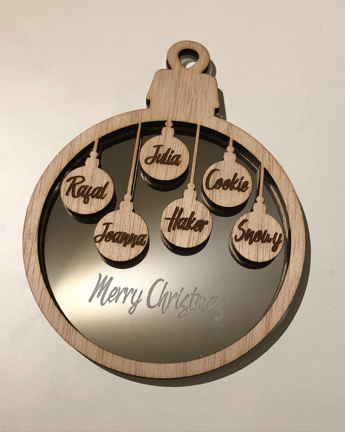 Gepersonaliseerde familie Kerstbal: Lasergesneden uit 3mm dik hout met een spiegelende goud of zilver acryl achtergrond.